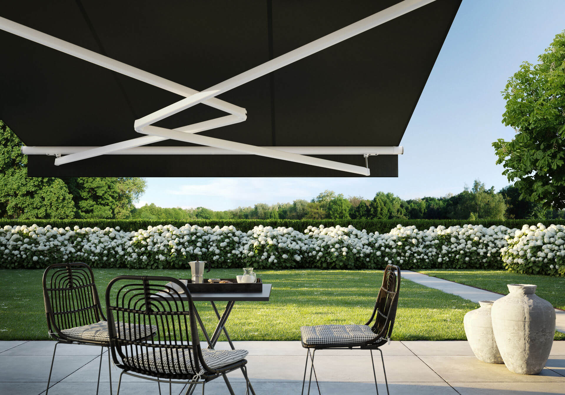 Kreieren Sie Ihre persönliche Terrassenatmosphäre mit Lichtstimmung, Musik und geöffneter Markise.